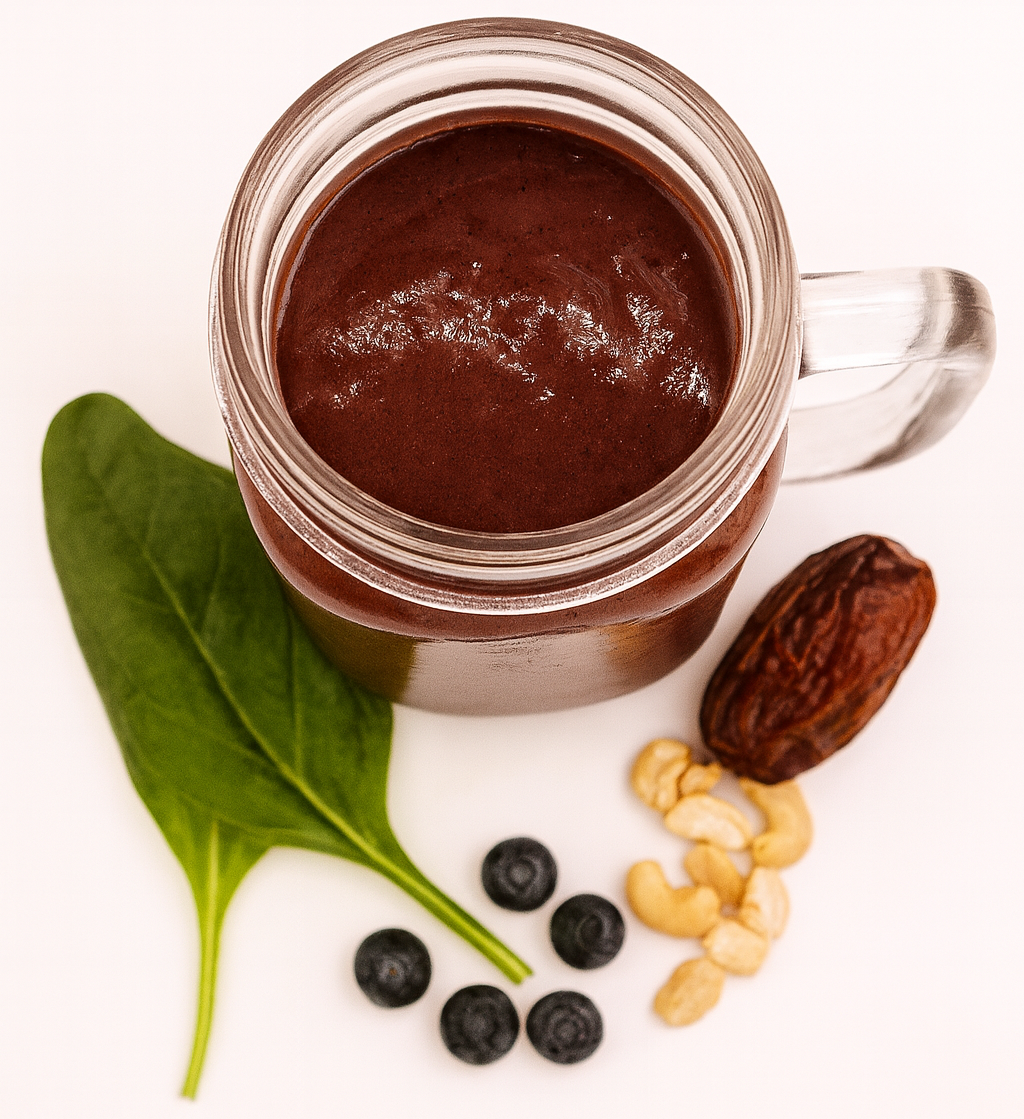 Blauwe bessen, spinazie, cashewnoten, banaan, dadels, gedroogde gojibessen, citroensap,